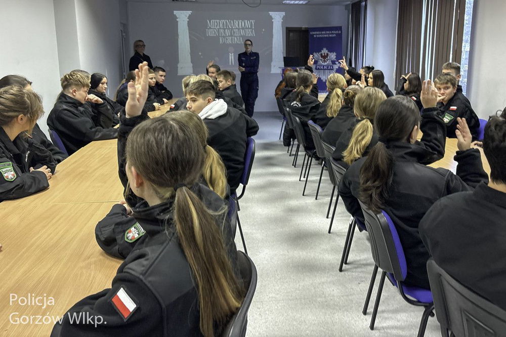 Uczniowie oddziałów mundurowych z klas pierwszych spotkali się z policjantami w Komendzie Miejskiej Policji w Gorzowie Wielkopolskim. Wizyta została zorganizowana 10 grudnia w ramach obchodów Międzynarodowego Dnia Praw Człowieka.