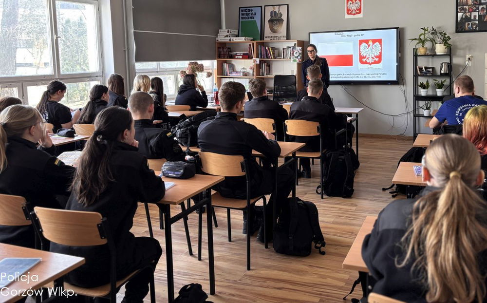 Policjantka z Komendy Miejskiej Policji w Gorzowie przeprowadziła w Zespole Szkół Technicznych i Ogólnokształcących zajęcia o polskich symbolach narodowych dla uczniów klas o profilu mundurowym. Lekcja obejmowała flagę, hymn i godło.